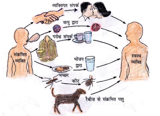 संक्रामक रोग पीड़ित व्यक्ति के संपर्क में आने से स्वस्थ व्यक्ति में फैल जाते हैं। सूक्ष्मजीव या संक्रमक कारक हमारे शरीर में निम्न साधनों द्वारा प्रवेश करते हैं– वायु, भोजन, जल, रोग वाहक द्वारा, लैंगिक संपर्क द्वारा।
